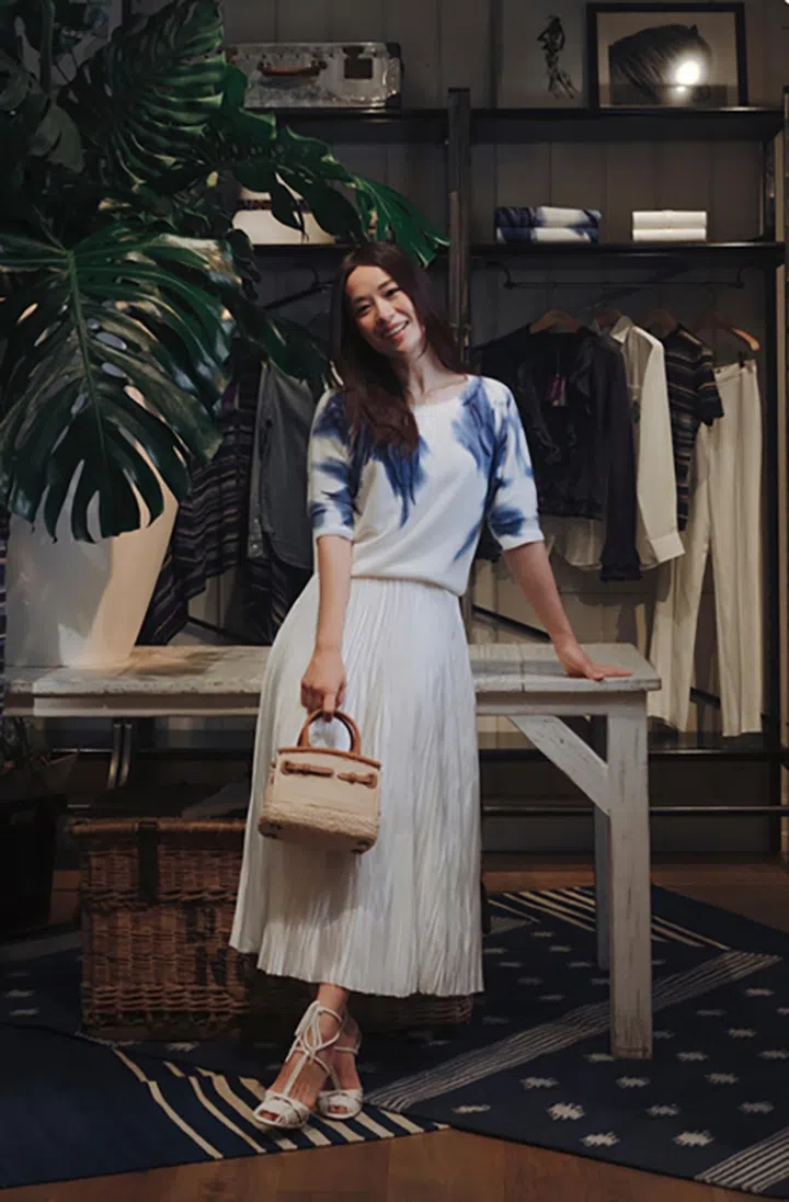Sonia穿着Ralph Lauren Collection的亚麻衬衣,并搭配拼接印花的亚麻长裤,整体色彩一致又斑斓,看头多多又保持简约、休闲。
