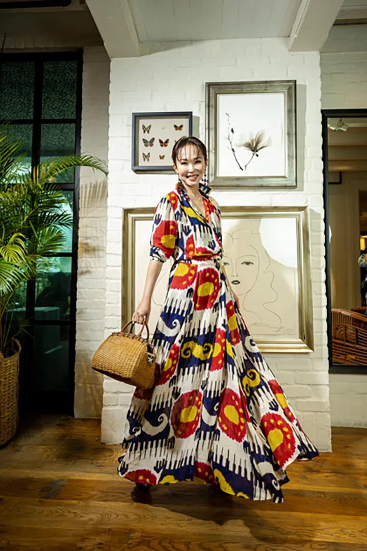 Ralph Lauren Collection今季采用了超多明艳大胆的印花及图案,灵感来自亚洲各地如Uzebkistan及Tajikistan等,同时也受到中东、非洲、拉美等地的影响。范文芳选择以花纹醒目的亚麻长裙搭配迷你水桶袋,造型醒目又衬肤色。