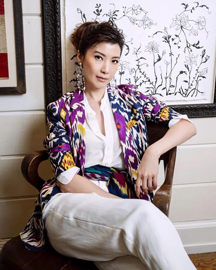 欧萱穿着Ralph Lauren Collection今季的Ikat(拼织)印花丝质西装,搭配亚麻白衬衣及亚麻混纺长裤,并在腰间装饰Ikat印花丝巾与上衣相呼应,演绎轻松的度假风格。