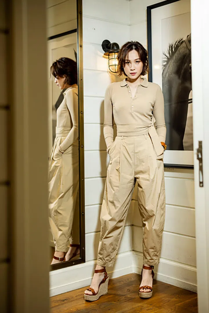 除了一片“花海”,雅慧就选穿Polo Ralph Lauren的罗纹修身Polo Shirt,搭配同色棉质长裤及楔跟鞋,像这样自然优雅的中性色调,也是今季流行的一大趋势哦。