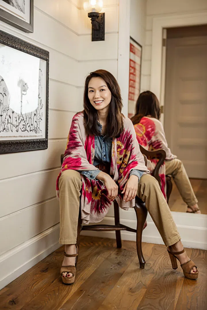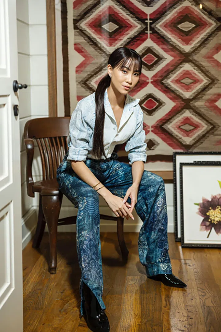 白薇秀穿着Ralph Lauren Collection采用ikat印花的亮片缀饰Ruana cape,搭配棉质亚麻单宁衬衣及米色长裤,风格优雅又散发异域风情。