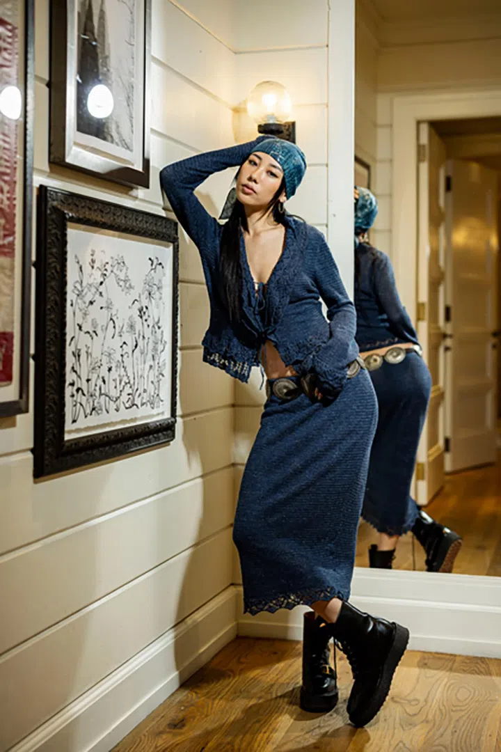 Mae Tan选穿Ralph Lauren Collecton的荷叶边开衫及同款裙装,系上拼接印花的丝巾做头饰,再搭配帅气短靴。展现波西米亚风格的同时,也秀出型格十足的街头个性。
