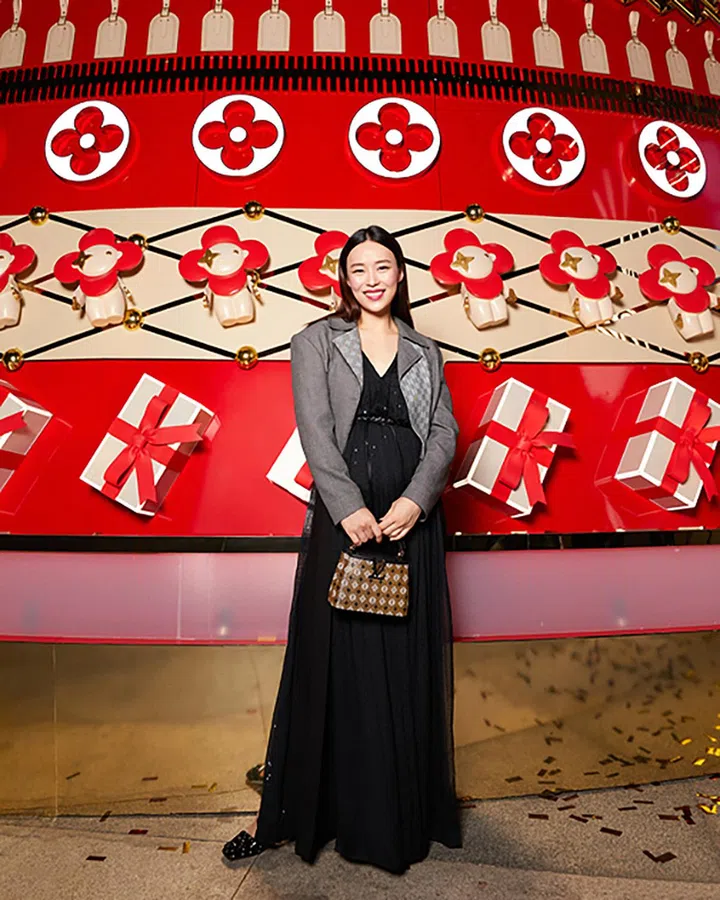 林慧玲和节日树合影,可见树上的装饰独特,不同于寻常圣诞树:上面带有超过900个标志性Louis Vuitton装饰,包括其著名的吉祥物——Vivienne、Gaston和DouDou,及品牌标志性设计如Speedy、Alma、Alzer和Twist。