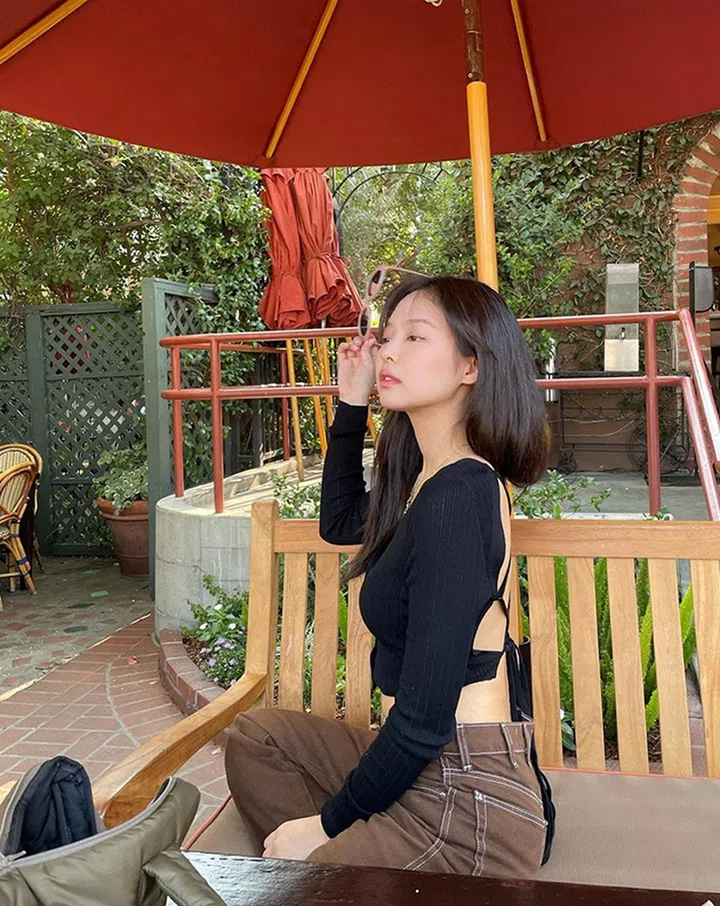 Jennie也是性感得极有高级感的韩星之一,这身造型她以Miu Miu的短版露背细带开襟衫搭配Reformation咖啡色牛仔裤及Maison Margiela黑色乐福鞋,造型休闲而轻松。