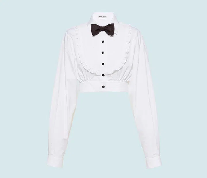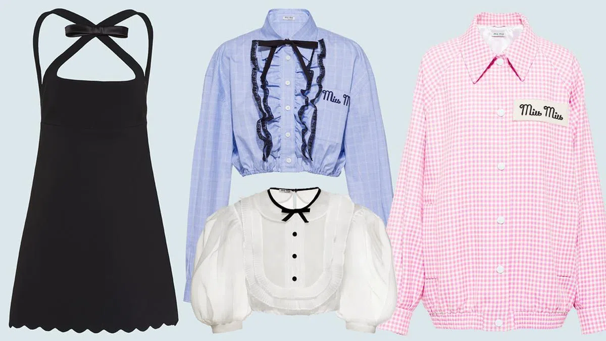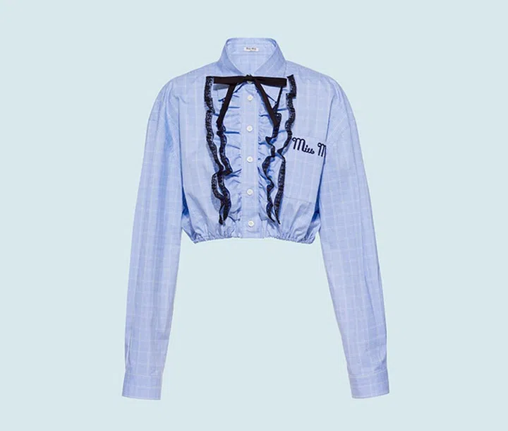 原本中性的格纹面料,在Miu Miu的演绎下也显得少女味十足。以黑色蕾丝装饰荷叶边,并点缀黑色蝴蝶结系带及刺绣标志,短版剪裁让你的比例更显修长。