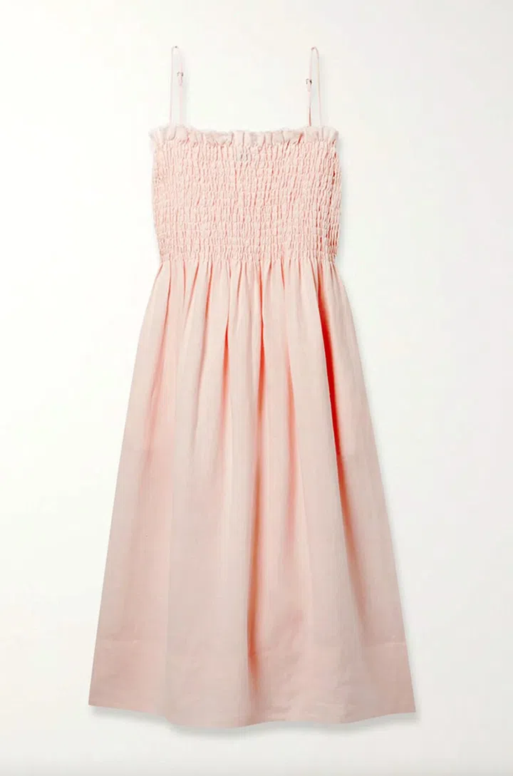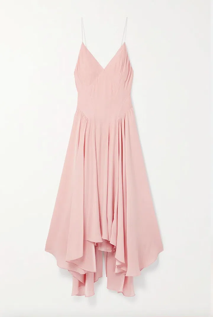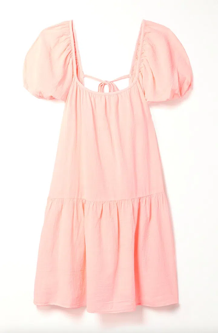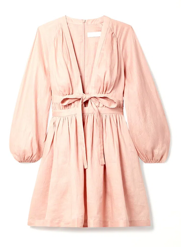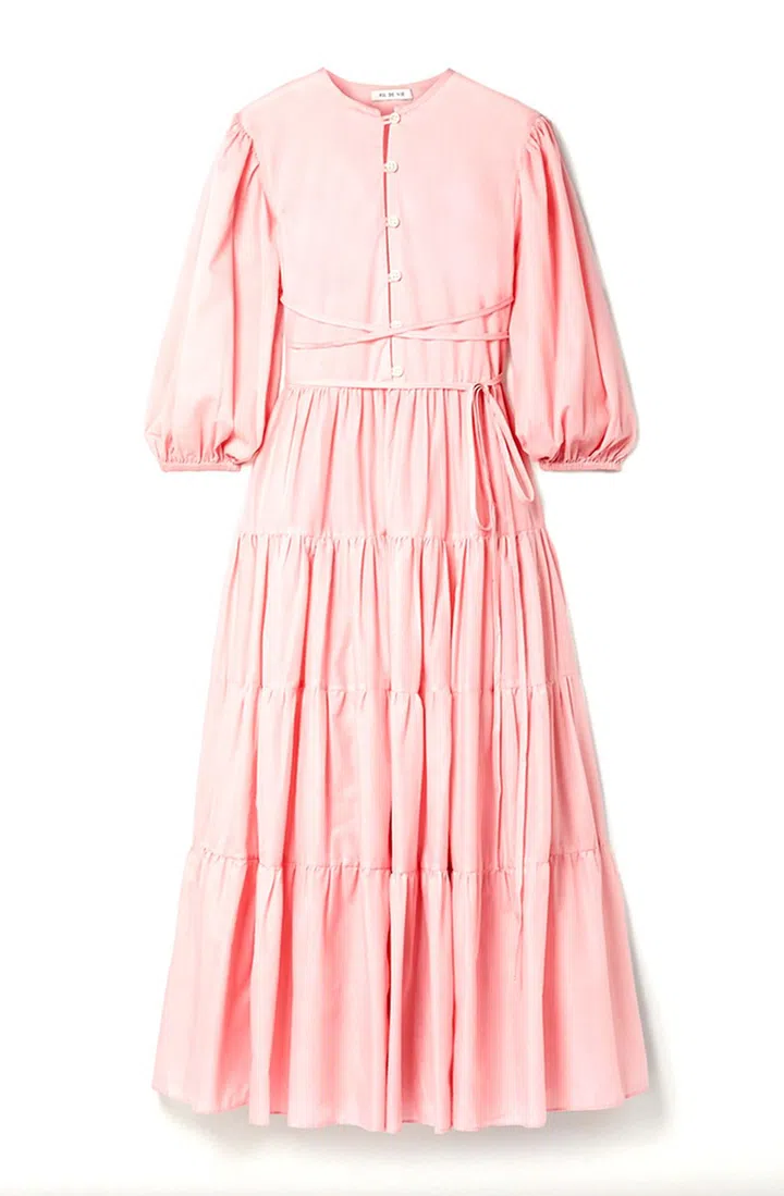 水蜜桃粉接近于Baby pink,都给人一种清纯甜美,纯真无邪的感觉。这款连衣裙结合考究的系带设计,以大廓形展现时尚感,同时也能勾勒出女性的腰身。