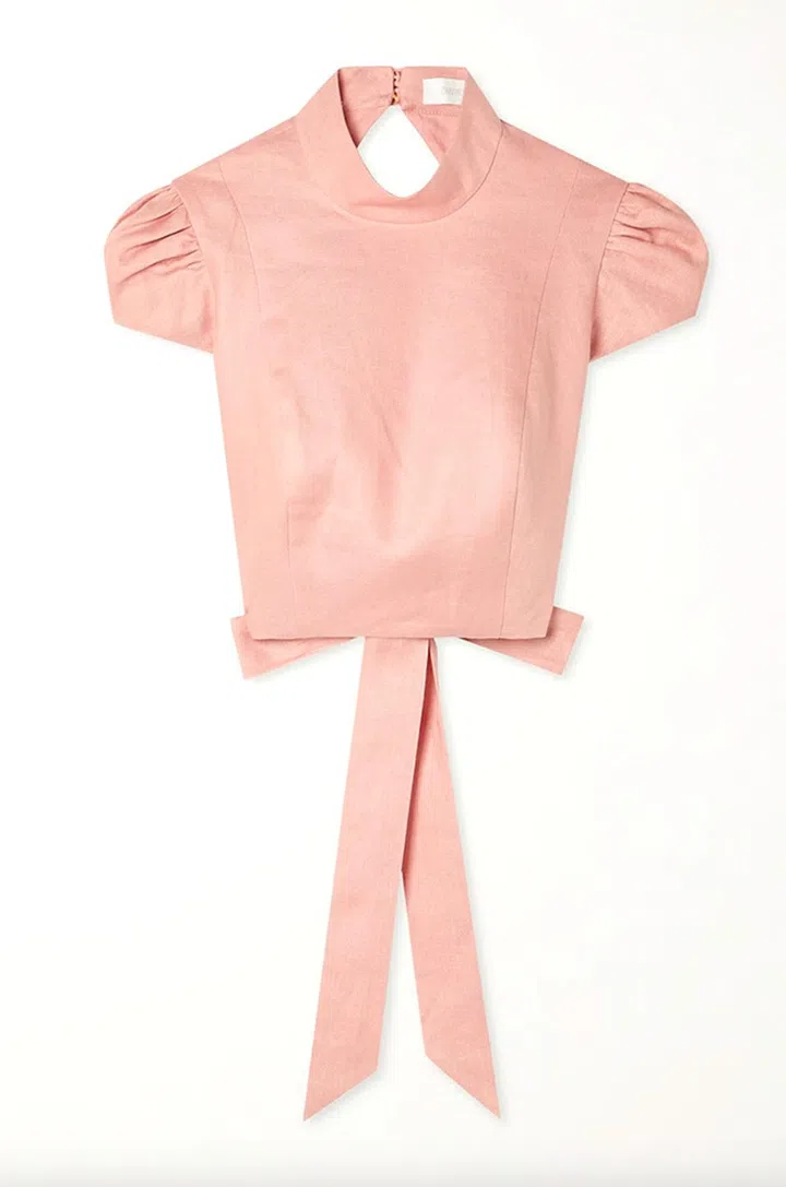 除前面两款亚麻材质的上衣及长裤,也有这款灯笼袖设计的粉色连衣裙,大V领直接开到腰部并以蝴蝶结做装饰,令造型性感又俏皮。怕太暴露?里面也可内搭白色比基尼,展现自然、轻松的时尚感。