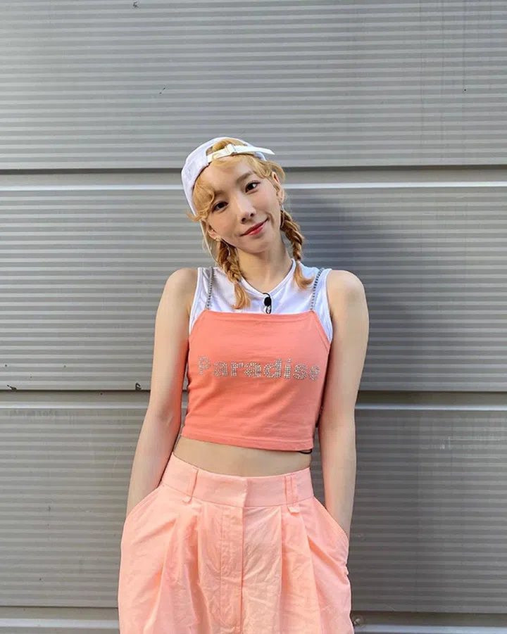 Taeyeon穿着Andtheother吊带上衣,搭配同色系长裤,造型犹如水蜜桃般甜美粉嫩。