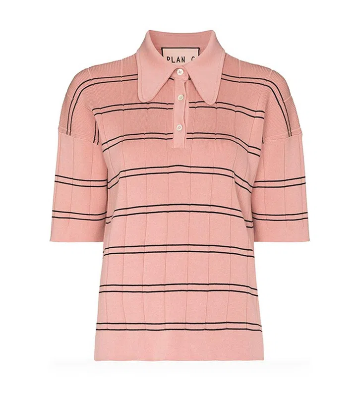 Polo衫越来越流行,但又怕自己穿起来显老气?试试这款“蜜桃粉”细条纹针织衫,搭配百慕大短裤,老爹凉鞋,再背上一款Bao Bao Issey Miyake手袋,就能显得型格十足。