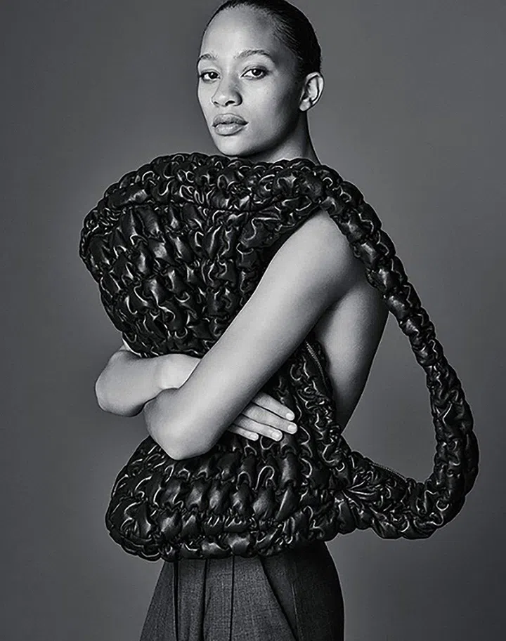 这次的云朵包和之前Bottega Veneta发布的款式又有不同,也可称它为“泡泡包”或“褶皱包”。英文是quilted bag或puffer bag,外形像是缝制而成的被子,里头有棉絮填充的效果,看起来蓬松柔软。缝制的手艺用行话说叫“绗(háng)缝”,是指用长针缝制有夹层的被子,使里面的棉絮等固定。