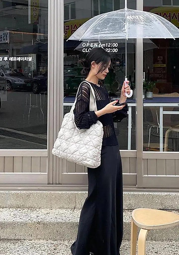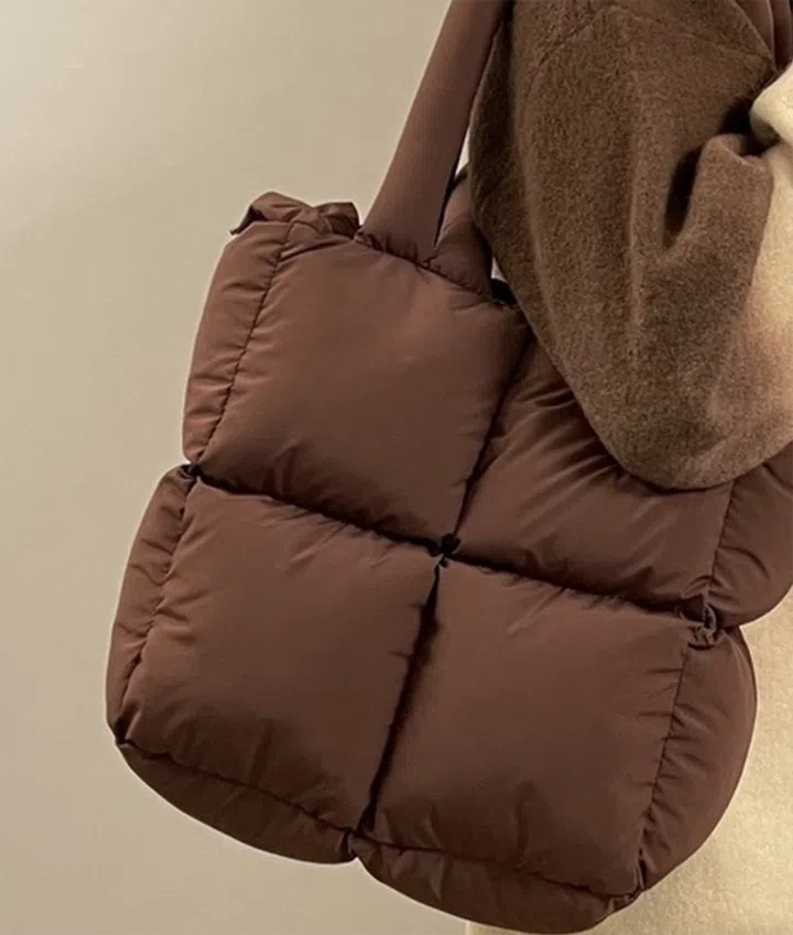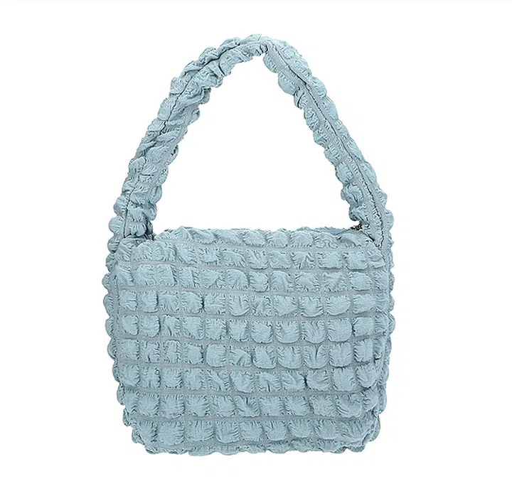 云朵包的热潮在网购世界更加流行,如果在Shopee等平台搜索“quilted bag”或“puffer bag”,会看到不同选择,价格也很便宜,20元左右就能挑到不错的设计。除了常见的斜挎版和月牙形包,圆鼓厚实四四方方的托特包也很特别,有大尺寸可以装下手提电脑,也有四宫格设计可爱圆润,带出门到咖啡座等地方,或许还能当靠背的垫子用。