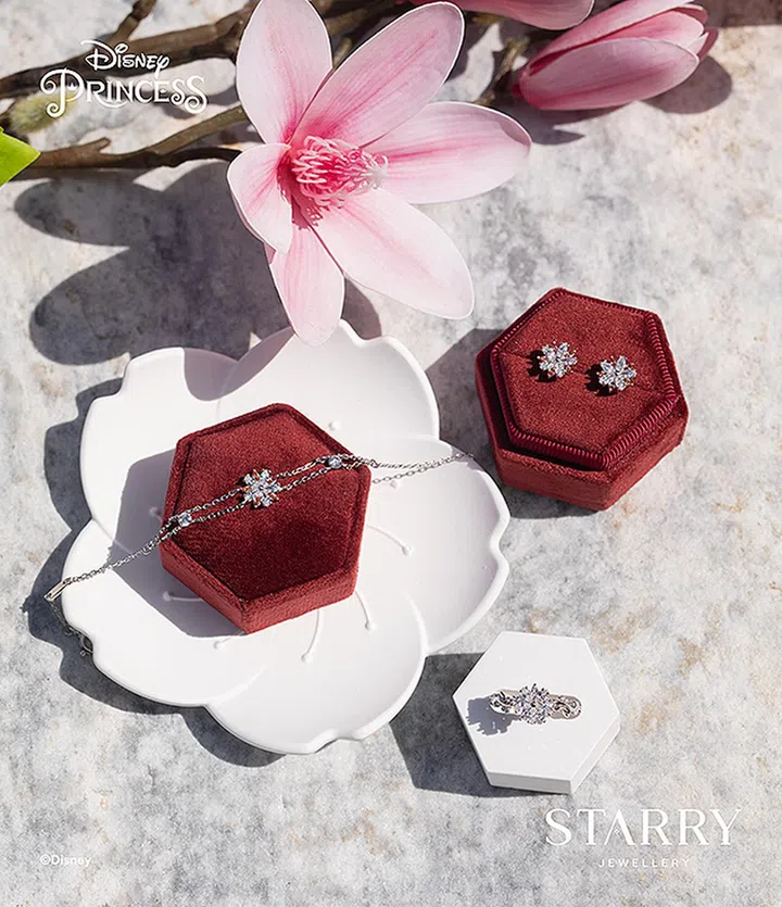 说到迪斯尼,怎能少了经典的公主们呢?Starry Jewellery带你重温木兰传奇,并为这位勇敢的公主设计了一系列首饰,包括手链($108)、戒指($98)以及耳环($98)。这些首饰设计复杂但细节满满,并以独一无二的木兰花为主题展开。绽放的木兰花高贵无暇,附带着的丝丝红瓣,宛若无畏的木兰公主,提醒我们要拥抱真实的自己。简单又百搭,这是你必不可少的收藏!