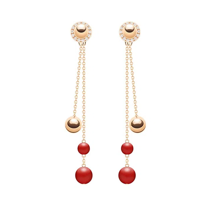 Piaget推出这款艳丽的红色玛瑙与18K玫瑰金耳坠,镶上28颗精工切割的钻石。佩戴后垂在脸颊两侧,为你新年的红色装扮画龙点睛,展露出大方的贵气。
