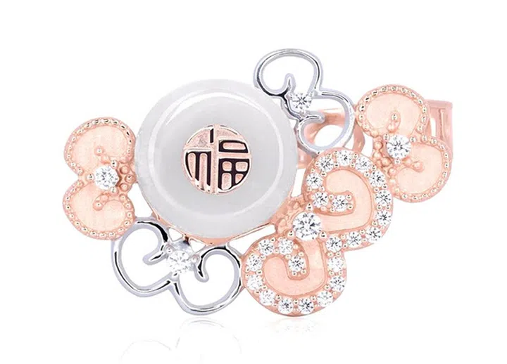 本地珠宝首饰品牌Carrie K.为新春佳节推出“福”戒指。灵感源自《尚书·洪范》中的成语“五福临门”,以14K玫瑰金刻出吉祥的“福”字为中心环绕着绿翡翠,5只线条灵巧的“蝙蝠”围绕着翡翠翩翩起舞。戴上这戒指寓意着五福(长寿、富贵、康宁、好德、善终)在这新年里将汇聚于一身。