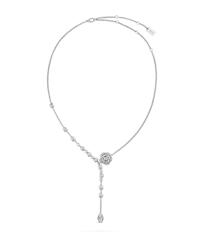 Chanel以香奈儿夫人最爱的山茶花作为灵感与设计元素,推出这款不对称的缀饰项链。典雅的白金以及钻石垂坠在脖子上显得格外优雅和有气质,搭配旗袍穿戴更是大展典雅韵味。