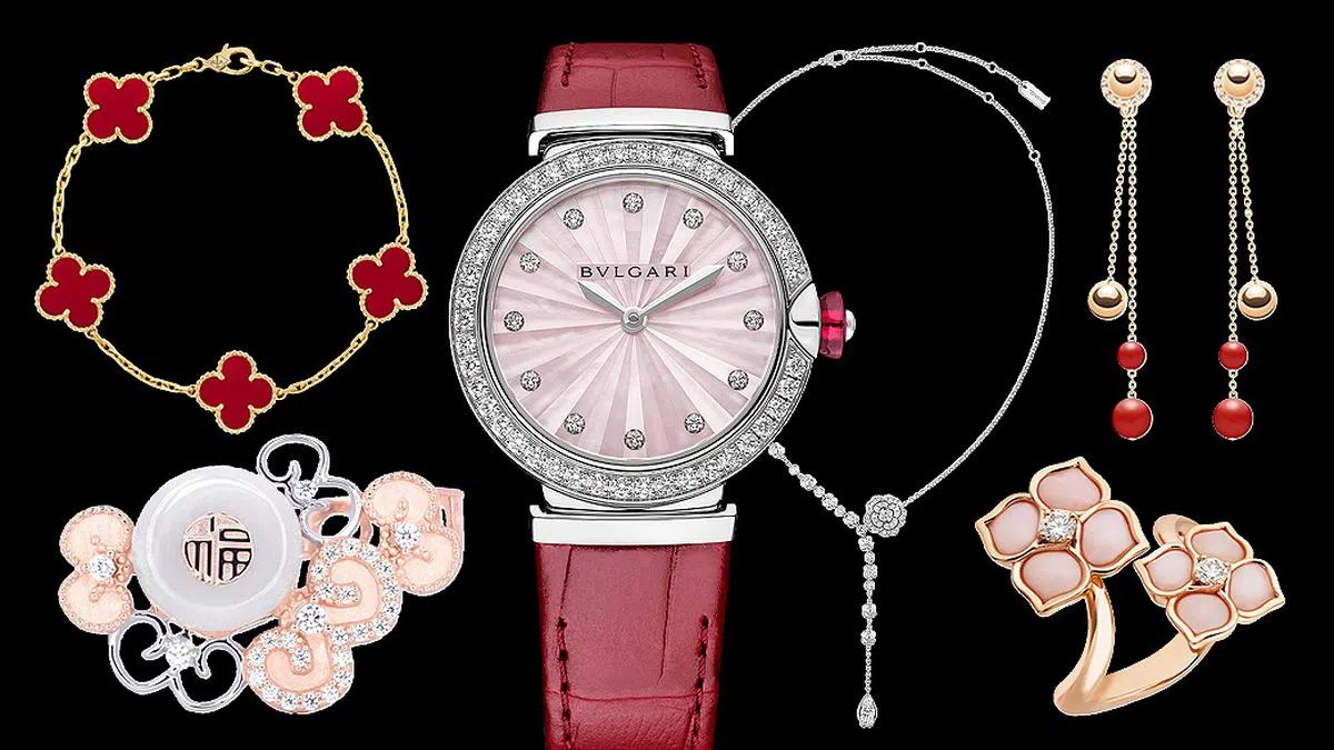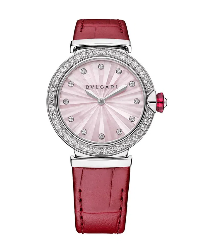 新年里少不了经典喜气的红色。若造型上需要红色点缀,但又不想typical的大红大紫,可选择以Bvlgari的这只红色皮革手表进行搭配。注意表盘上的立体效果,是以粉色系珍珠母精制而成,并凑在一起诠释出太阳的万丈光芒。