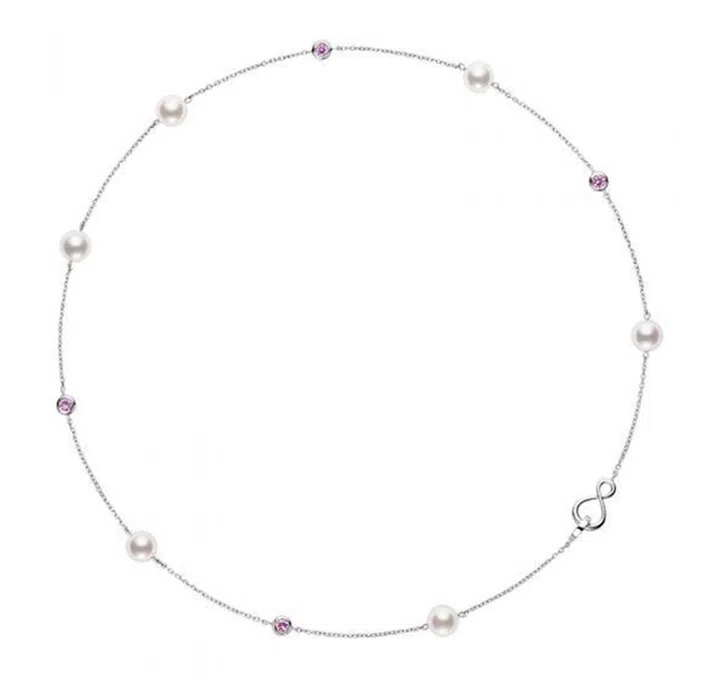 Mikimoto将中华文化精髓与日本传统金工工艺技术巧妙结合,将传统幸运结所蕴含的吉祥幸福、团圆美满的寓意,以现代美学方式来诠释系列中的首饰。细腻的Akoya珍珠及粉红色蓝宝石间隔串接在一起,精巧的设计贵气却不张扬。
