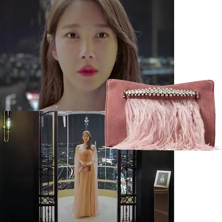 首集开场,剧中饰演顶楼女主人的李智雅,身穿Georges Chakra 2019春夏露肩礼服,搭配粉色Jimmy Choo羽毛clutch,以女神般的优雅气质准备出席派对。