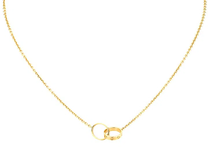 Cartier诞生于1970年代的Love系列,除了让人印象深刻的戒指及手镯,别忘了也有项链款式。上图这款两环相扣的Love项链,如同恋人的心缠绕在一起,真挚而热烈。