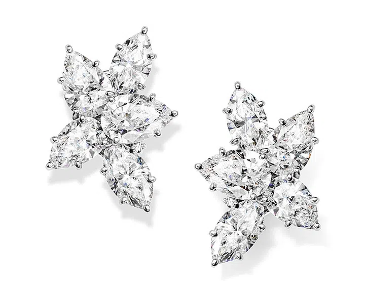 Harry Winston的Winston Cluster耳坠,结合梨形钻石及犹如爱人嘴唇的马眼形(marquise-shaped)钻石,以不同角度进行组合镶嵌,展示出品牌精湛切工的同时,也让钻石耳坠在最大程度地折射出耀眼光泽。