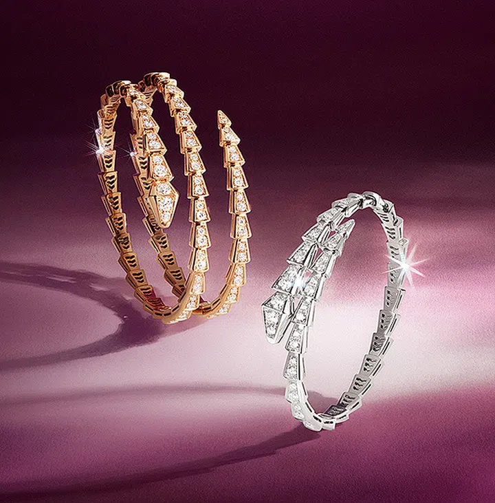 两款均密镶钻石的玫瑰金双圈手镯及白金单圈细手镯,设计捕捉Serpenti Viper手链的魅力,演绎出诱惑又迷人的灵蛇姿态。外加闪烁钻石光芒的“蛇鳞”,各个角度都让人惊艳。