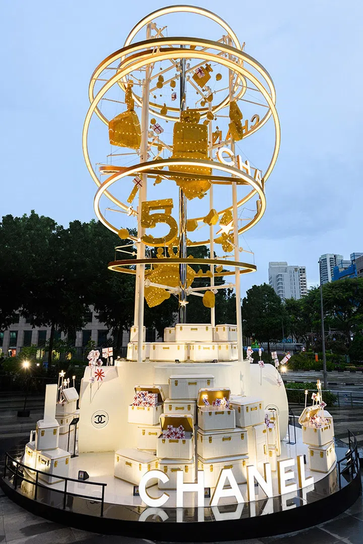 为欢庆Chanel No.5 Perfume香氛面世100周年推出的18米巨型装置,白天看上去典雅壮观,夜里亮灯后则绚烂绮丽,无论何时都十分适合打卡。该装置以旋转的星体和具标志性的香奈儿商标为设计,再以品牌经典色黑、白、金为主色调,打造出一个简约大气,豪华迷人的“香奈儿宇宙”。