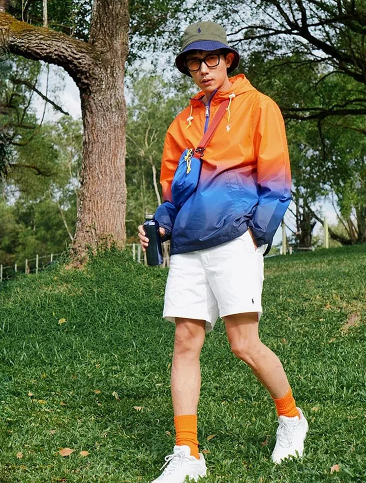 天生的衣架子,陈炯江穿上休闲的Polo Ralph Lauren连帽外套与短裤,再以大胆的橘色袜子与上衣相呼应,整体造型凸显出街头个性。