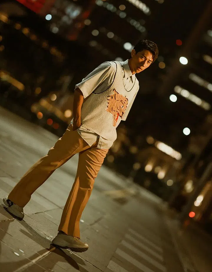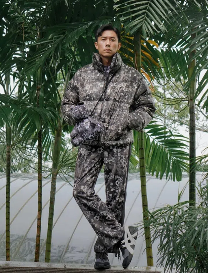 陈炯江身穿时尚运动品牌Onitsuka Tiger与日本纺织及平面设计品牌nowartt合作推出的服饰系列。“复古 x 艺术” 和 “手绘 x 数码艺术” 互相矛盾的概念组合,以手绘大吉岭花卉结合数码纺织图形巧妙地运用在现代轮廓上。这身造型穿在陈炯江高挑的身型上酷炫非凡,斜挎的“熊熊玩偶包”也削弱不了他的时尚范。