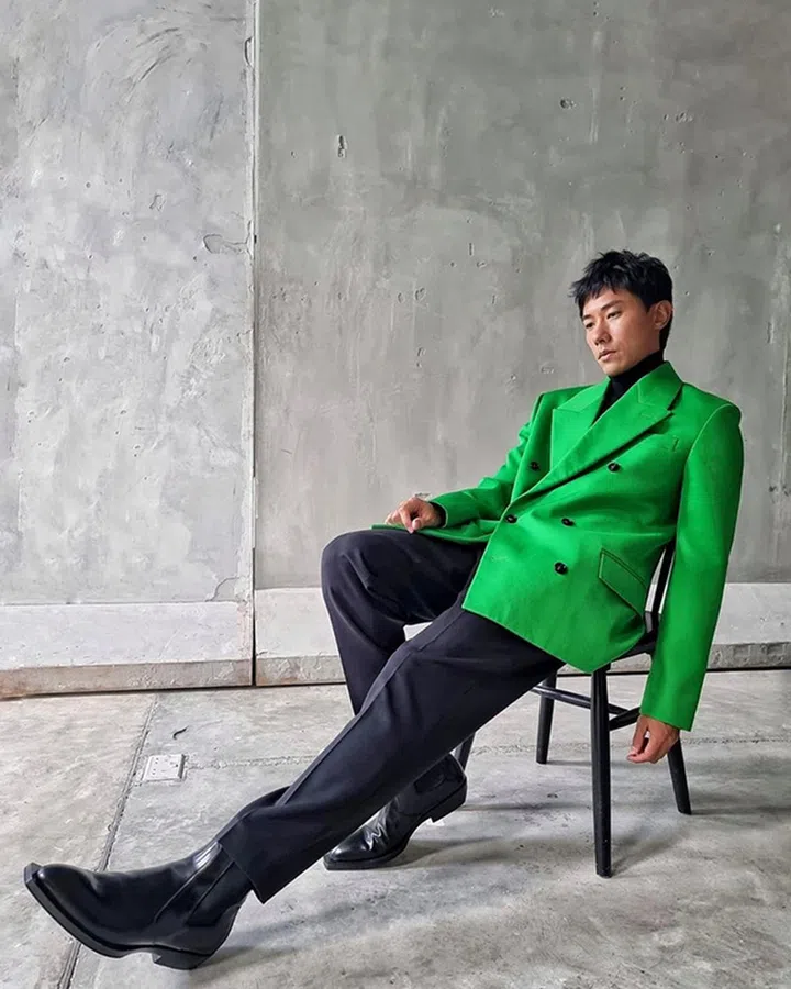 今年最流行之时尚绿也出现在陈炯江身上。亮眼的Bottega Veneta绿西装外套套在黑色高领毛衣上显得格外有品位。