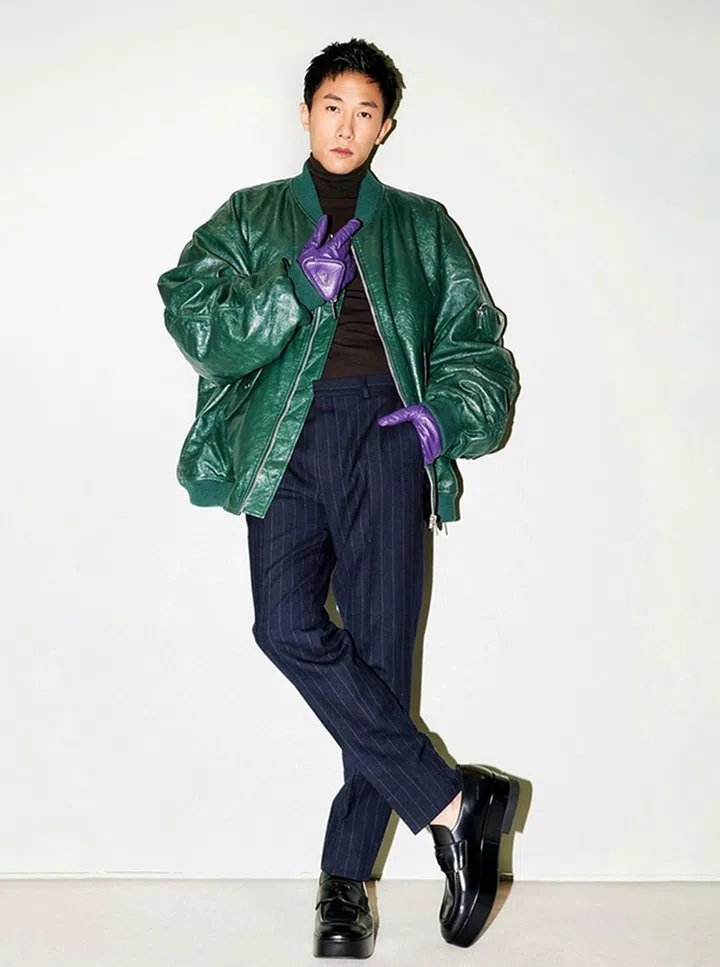 陈炯江身穿Prada 2021年秋冬系列(Raf Simons与Miuccia Prada共同创造的第二系列)。深褐色高领毛衣搭配高腰条纹长裤,外套大廓形皮革飞行员夹克,再以标志性的紫色皮革手套完装。多元元素质感碰撞出精彩绝伦的时尚质感。