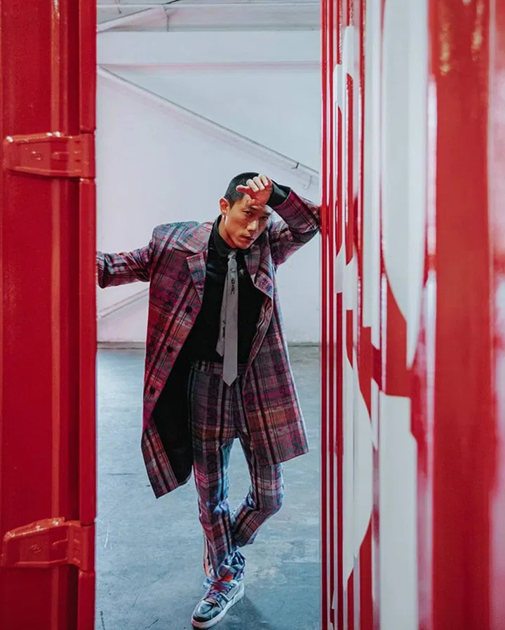 早前Louis Vuitton为配合2021年春夏男装系列的发布,将发布会上的红色LV集装箱搬运至新加坡。受邀出席的陈炯江,以一身帅气的格纹西装搭配炫目的运动鞋出席,酷!