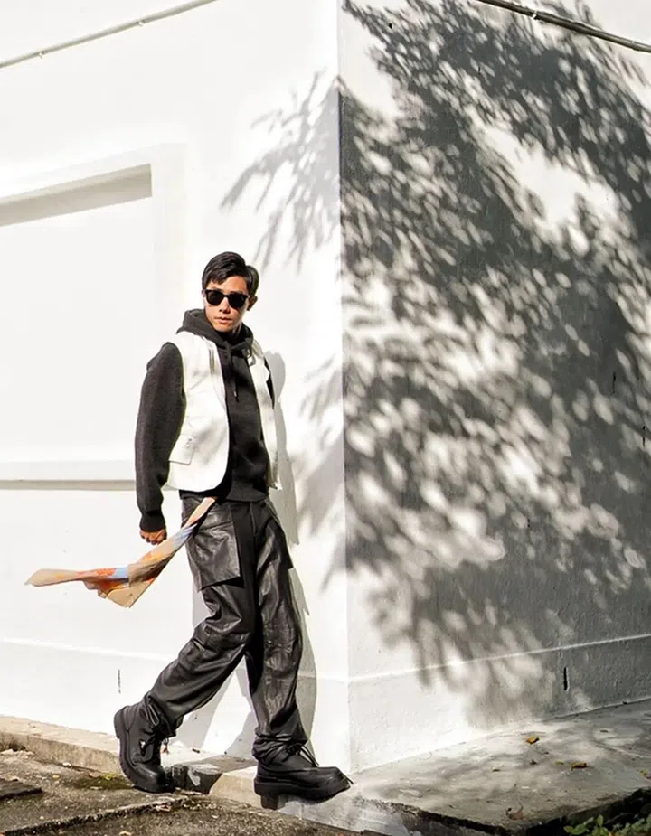 陈炯江身穿Salvatore Ferragamo,一袭黑色装扮(黑色连帽衫搭配皮革长裤与黑靴),以白色马甲外套以及彩色花卉印花丝巾点缀,大展非凡的classic帅气。