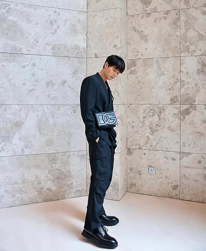 一身黑的西装,特别考验男生的身材与气质。Glenn身着Dolce & Gabbana的黑色深V西装,配搭品牌的Logo手袋,带点坏坏的魅惑气息,像极了韩剧中酷炸的“校霸”!