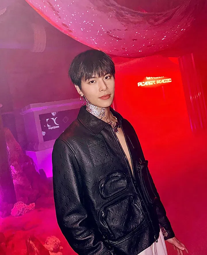 属于男生的性感!11月份出席活动的他,穿上Louis Vuitton的黑色外套,外层缀满了经典的Monogram压花图案,并配有大大小小的贴袋设计,外套内不穿任何单品,“配饰”是脖子上的银色贴膜,展现酷酷的前卫风格。