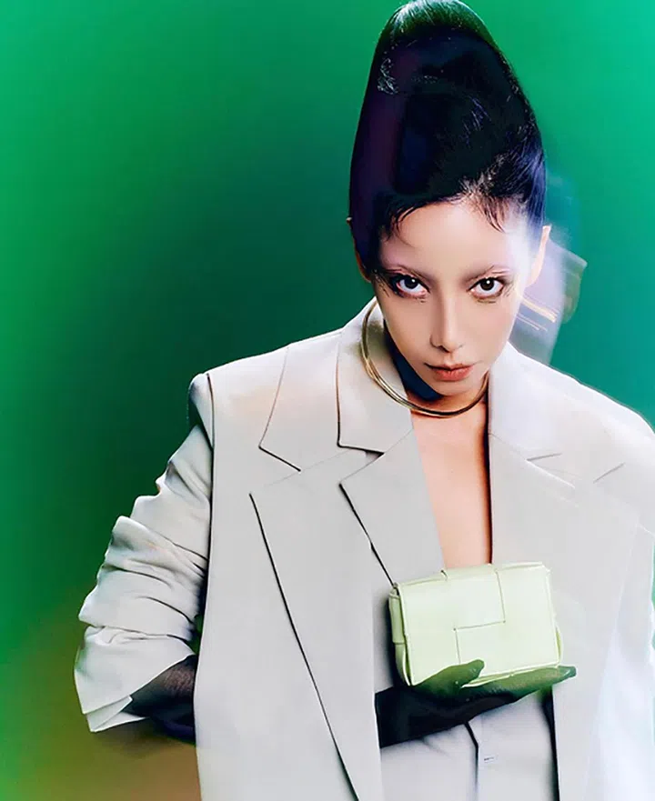 又美又飒的Edgy style在她身上也毫不突兀。以Bottega Veneta大地色系的廓形外套,配搭金属圈项链,简洁却充满力量感,散发都会女性的自信态度。