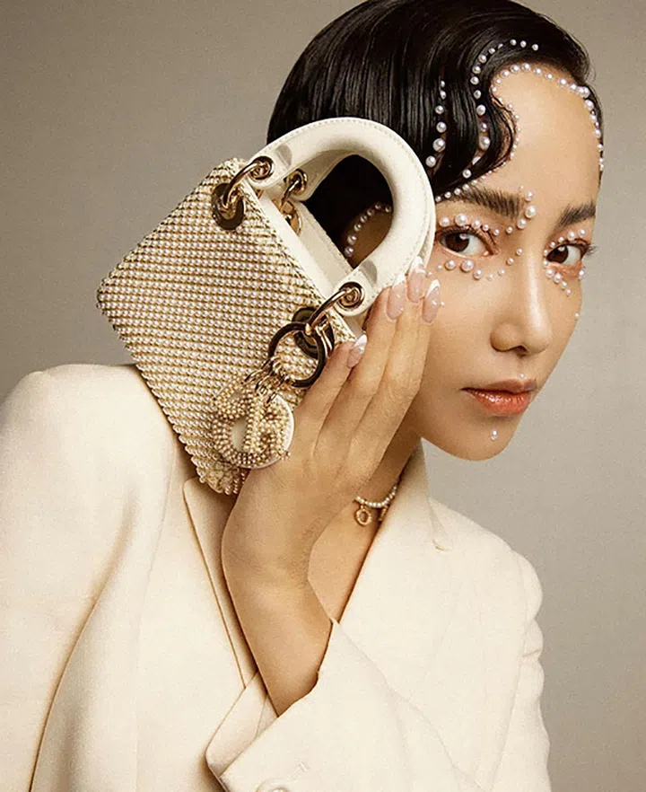 叫她百变女郎!Fiona身穿白色西装外套,拎着可爱爆表的迷你Lady Dior手袋,为了呼应包包上的白色珍珠缀饰,她的妆容也融入了创意十足的珍珠元素,变身温柔复古的俏女郎。