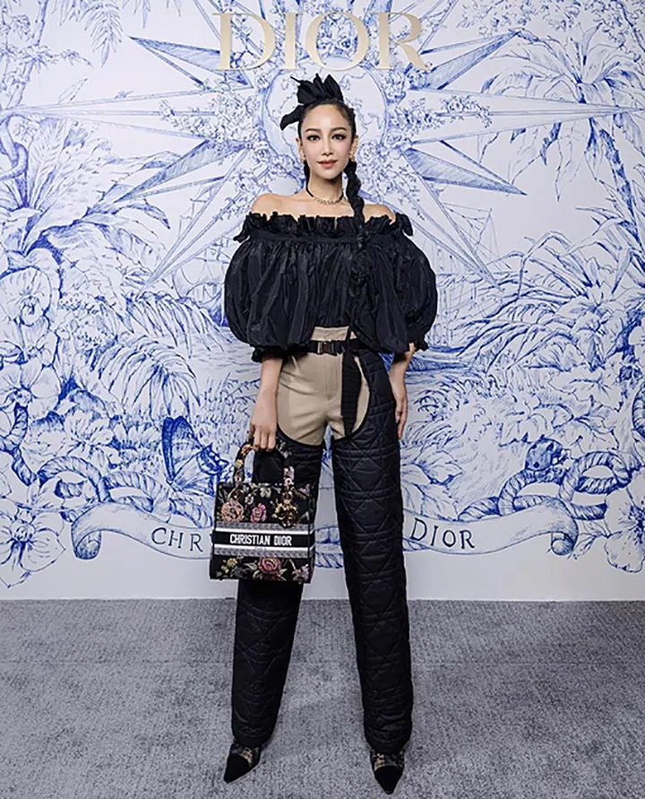 Fiona的穿搭风格向来多变,10月出席Dior活动,身穿品牌2023 Cruise度假系列单品,以大蓬袖露肩上衣配搭拼接长裤,身高165公分的她成功穿出长腿比例,充满个性的妆容和发型也为整体造型加分,酷美暗黑风让人过目难忘。