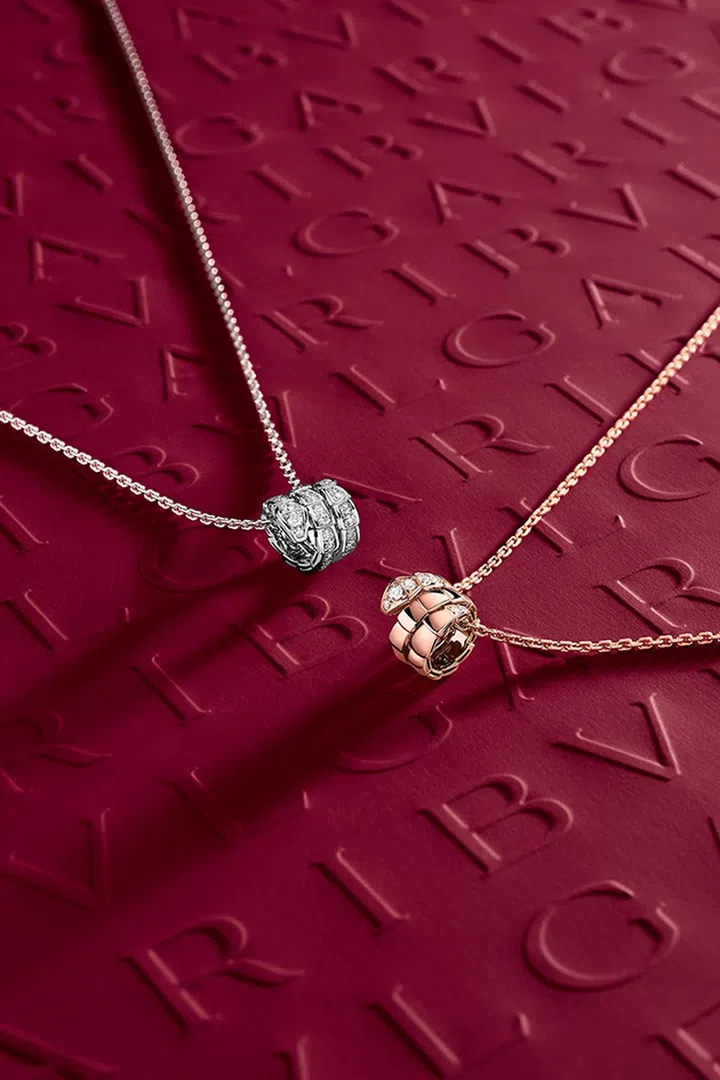 项坠以几何图案和利落造型勾勒灵蛇之姿,点缀在项链上精致又迷人,搭配品牌的灵蛇造型戒指,彰显意大利式的优雅奢华美。