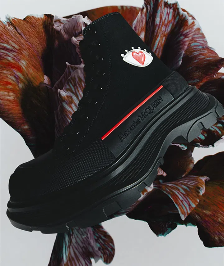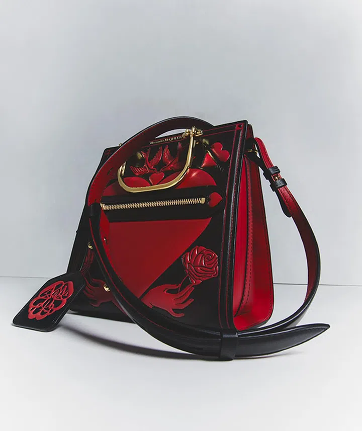 为庆祝新年和情人节,Alexander McQueen推出胶囊系列,包括新款Short Story手袋,手机包,球鞋及丝巾。上方这款是品牌为2021年春夏季推出的限量版Short Story手袋,装饰火红的心形元素及图案,使手袋更具收藏价值。