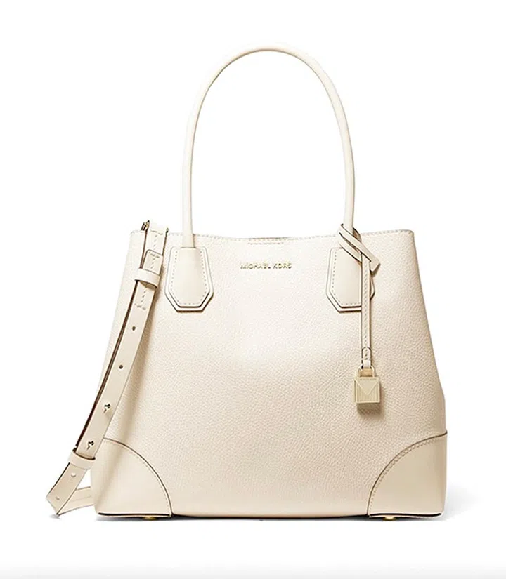 淡雅的奶油色调,可拎可挎的灵活设计,为你朝九晚五的职场生活注入更多时尚活力。手袋内里空间宽敞,中层拉链袋可放入各种私密小物,两侧隔层用来装iPad、墨镜、消毒液和化妆袋都绰绰有余。