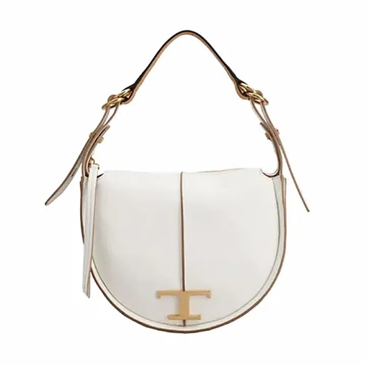 Tod’s的经典半月形手袋,线条流畅简约,以皮革制成,中间以棱纹设计,缀有品牌金属T形饰扣,并设有可调节提手。早秋系列推出了更多新色,包括白色、紫色和褐色。