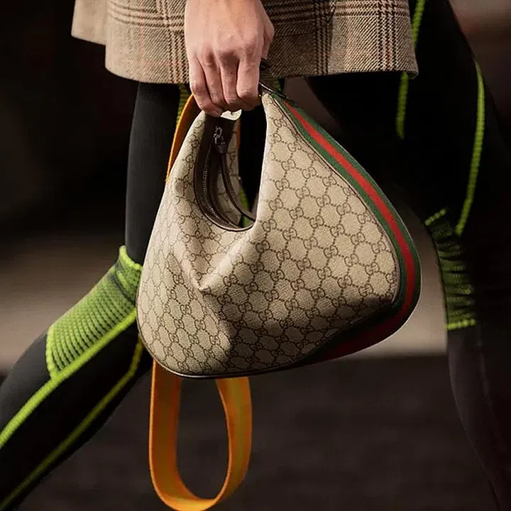 Gucci今年7月推出的瞩目之作,在时下流行的新月包型融入了最早常见于品牌男士公事包上的经典字母图案帆布设计,打造独具风格的手袋。另一个亮点元素是金属感的银色G字钩扣开合,让包包呈现宛如Fortune Cookie般的可爱形状。