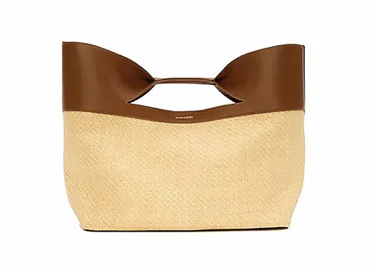 Alexander McQueen早秋系列新品The Bow,带弧形的手柄设计独特,也呼应了包包的名称,宛如蝴蝶结般别致趣味,有别于一般方方正正的托特包。配有大小两种尺寸选择,颜色有黄色、牛仔蓝,以及结合皮革和拉菲草的款式。