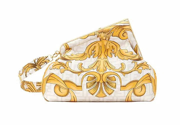 Fendi First手拿包在2021年7月推出,是品牌女装创意总监Kim Jones为Fendi打造的首个包款。不对称的轮廓设计、倾斜的字母F框架,成为这款手拿包的标志元素。本季推出的新款注入80年代的复古华丽气息,金色的巴洛克印花图案,点亮整体造型。