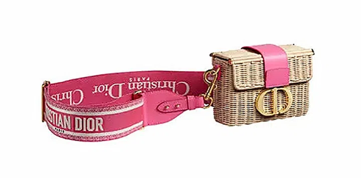 Dior较为少见的30 Montaigne手袋款式,来自今年夏季Dior的Dioriviera胶囊系列。品牌首次以米色柳编方式诠释这款经典包款,充满自然气息。方盒轮廓配搭可拆卸的荧光粉刺绣宽肩带,并印有醒目的品牌标志,让包袋更添魅力。
