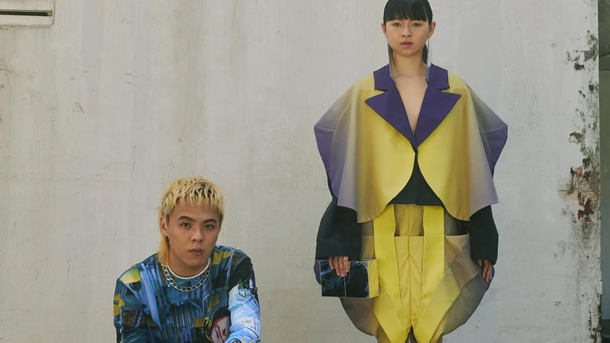 (From left) 毕业于NAFA的设计师Kean Chun Yee, 模特Kelly穿Chun Yee的毕业系列服饰