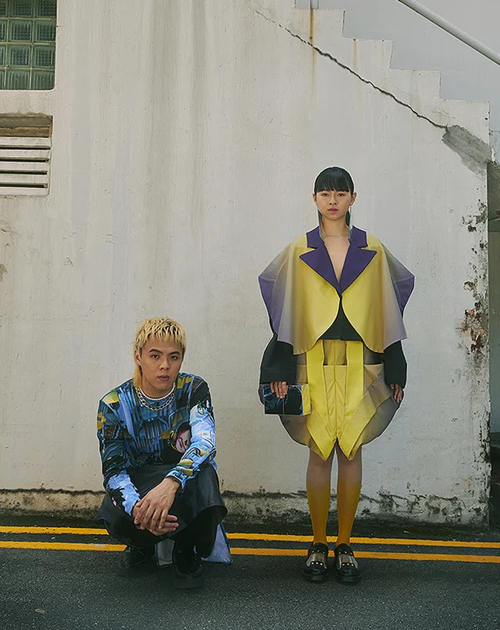 Chun Yee于马来西亚出生,三年前来到本地进修时尚设计。其毕业系列“Reflections and Perspectives”,灵感来自镜像模仿(mirroring)——也称边缘同步(limbic synchrony),即对他人动作的模仿。系列共五个造型,借助扭曲比例及优美弧线,重塑人体线条。再融入梦幻的色调,给人带来虚实相济的感染力。