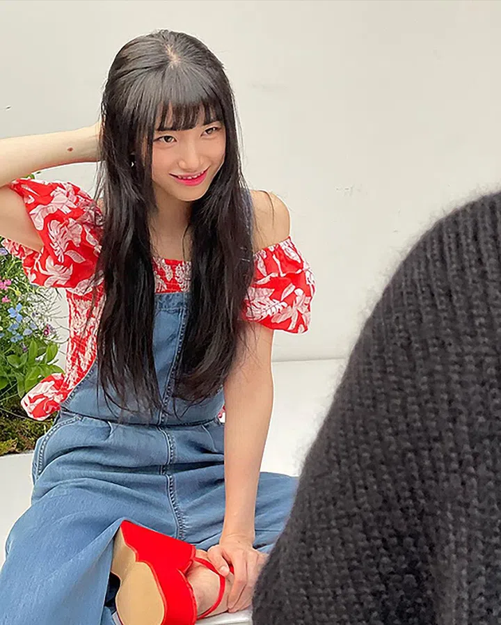 活泼俏皮的背带裤,是夏天值得购入的单品之一。除了搭配T-Shirt展现青春活力、抹胸诠释辣妹风,还可以像Suzy一样搭配一字肩上衣噢。红色的上衣+高跟鞋,尽显夏日独有的狂热!