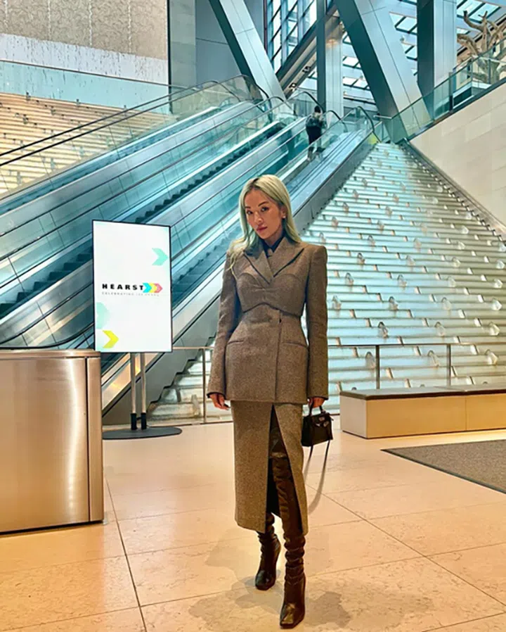 梁伊妮这身建筑感十足的灰色西装套装,来自Sportmax的2022秋冬系列。该设计看似硬朗,却也勾勒出身体线条,重新探索黄金时代权利套装的可能性。