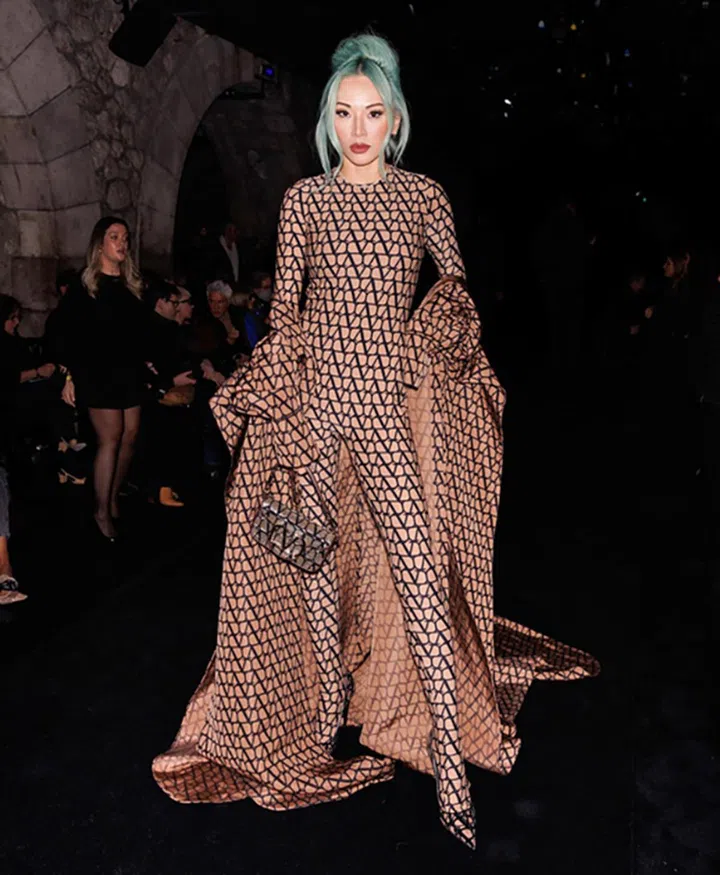 梁伊妮出席在巴黎举办的 Valentino Le Club 2023高定秀,穿着品牌2023春夏系列记忆度最高的通体V logo造型,视觉迷幻大胆,也配合了品牌这场大秀的“夜店”主题。